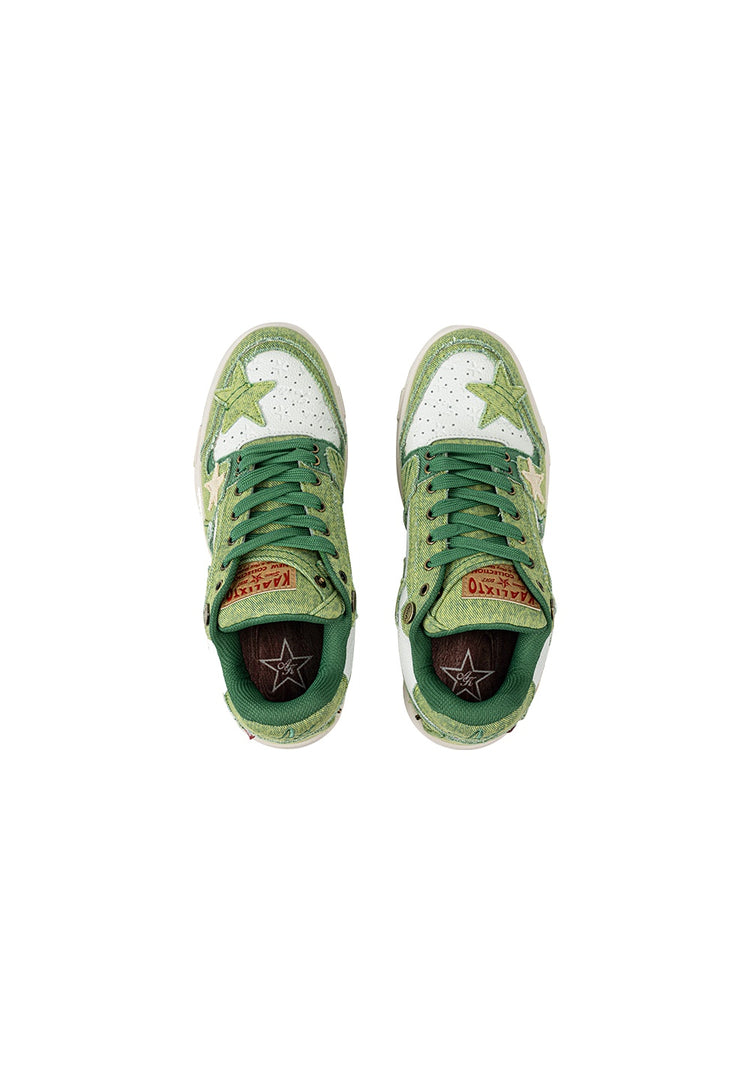 KAALIXTO green denim sneakers are inspired by avocados, breaking the limitations of traditional denim color schemes. The upper is made with denim in varying shades of green, paired with a vintage oxidized sole. An exclusive leather tag featuring avocado wood grain adds a distinctive touch, perfectly aligning with the avocado theme.