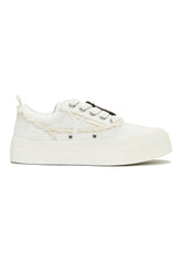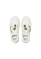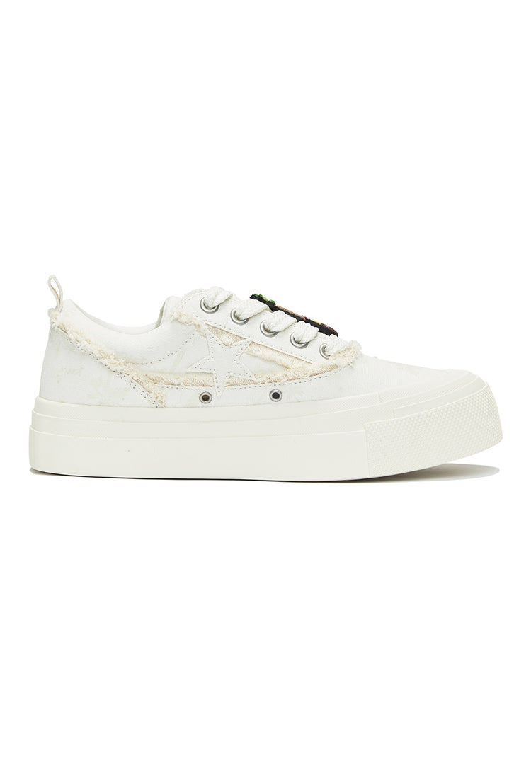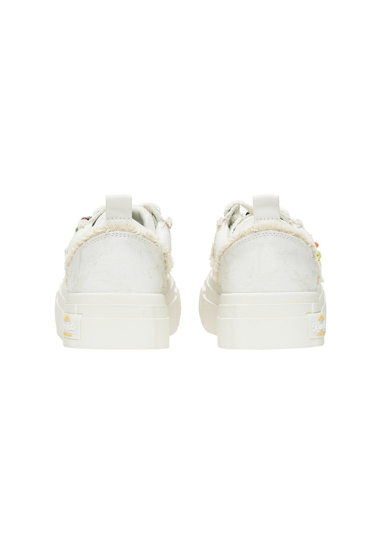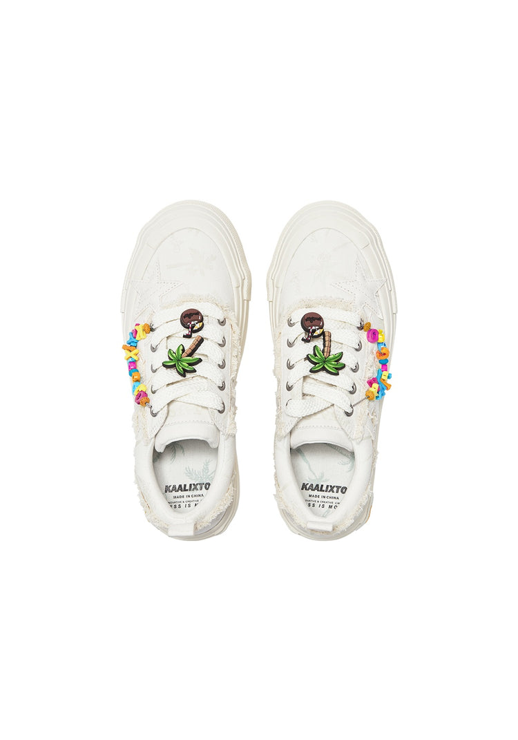 The shoe body uses light-changing printing technology and coconut tree elements. Under the sunlight, the shoe will appear with a blue coconut tree pattern. The feeling of summer sea breeze blows over your face. It is very summery and also provides more matchability and fun. The deconstructed design of the toe and shoe body also makes this pair of shoes full of details. The matte silver hardware selection adds texture. The original white canvas of the shoe body is also specially customized, which is comfortable and breathable while ensuring quality. The included dopamine-style colorful accessories and blue shoelaces provide more matching possibilities and are full of design.
